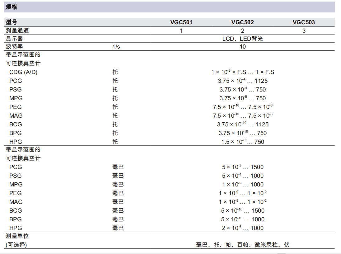 过程测量、控制和记录数据的可持续解决方案VGC50x系列主动真空计控制器可与各种INFICON主动真空计兼容,能够监测10-10至1500毫巴(10-10至1125托)的完整压力范围和设定点状态并记录相关数据。