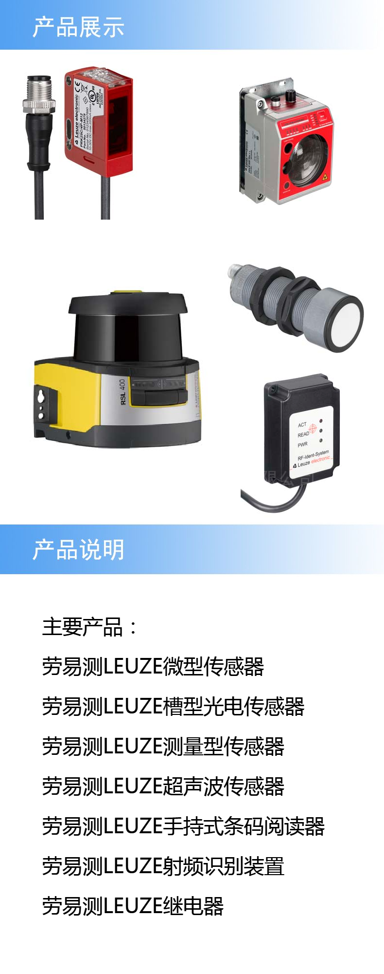 德国LEUZE光电传感器PRK 25成立于1963年是德资全资企业。劳易测电子集团在过去40多年的发展历程中,致力于开发光电传感器,自动识别系统,工业视觉系统,数据和传输系统,以及应用于防护和工业自动化领域中的光电类产品。如今,劳易测电子集团拥有26个实力雄厚的销售与技术服务分公司,凭借丰富的经验支持确保帮助客户在瞬息万变的市场中获得长期成功。