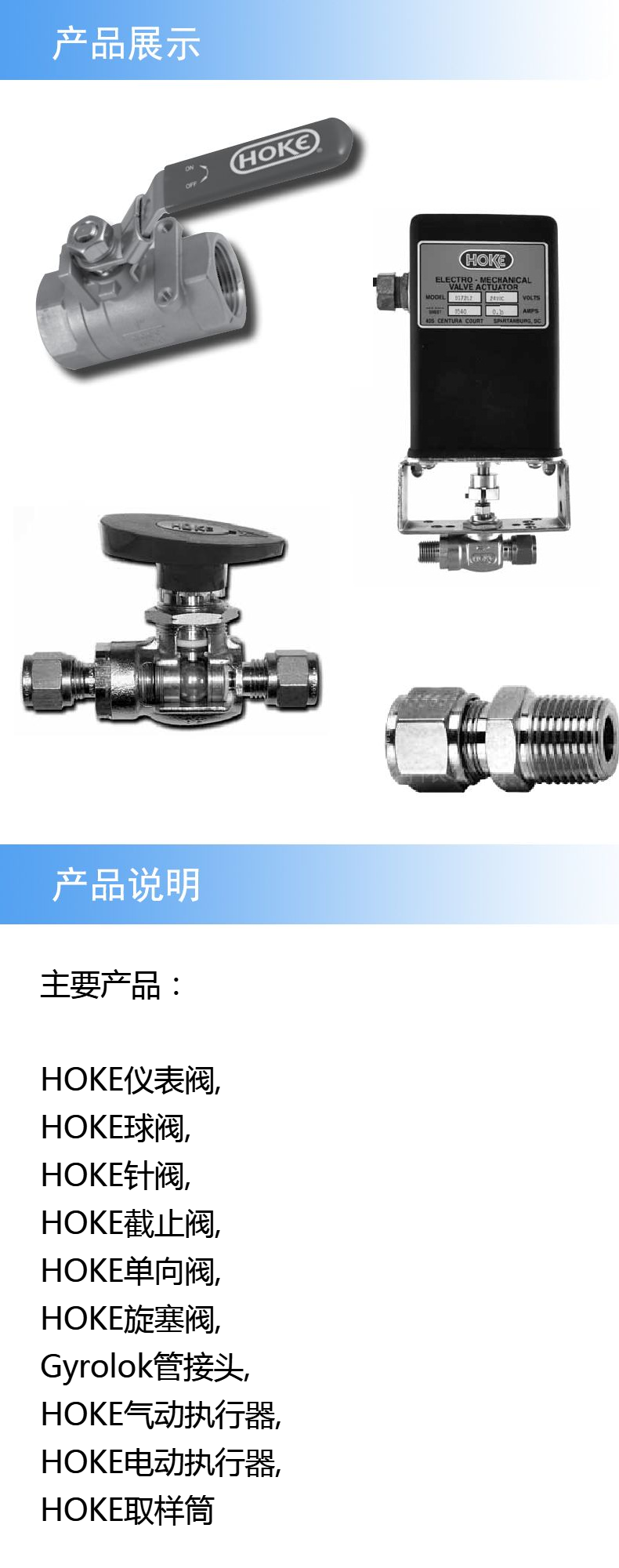 HOKE仪表阀,HOKE球阀,HOKE针阀,HOKE截止阀,HOKE单向阀,HOKE旋塞阀,Gyrolok管接头,HOKE接头,HOKE快速接头,HOKE螺纹接头,HOKE管接头,HOKE气动执行器,HOKE电动执行器,HOKE取样筒等等。