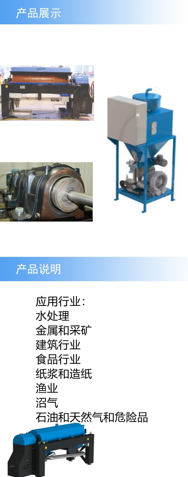 瑞典Noxon卧螺离心机应用行业:我们的客户在许多不同的领域开展业务。将它们结合在一起的是需要将液体与各种颗粒分离。比如:水处理、金属和采矿、建筑行业、食品行业、纸浆和造纸、渔业、沼气、石油和天然气和危险品等。